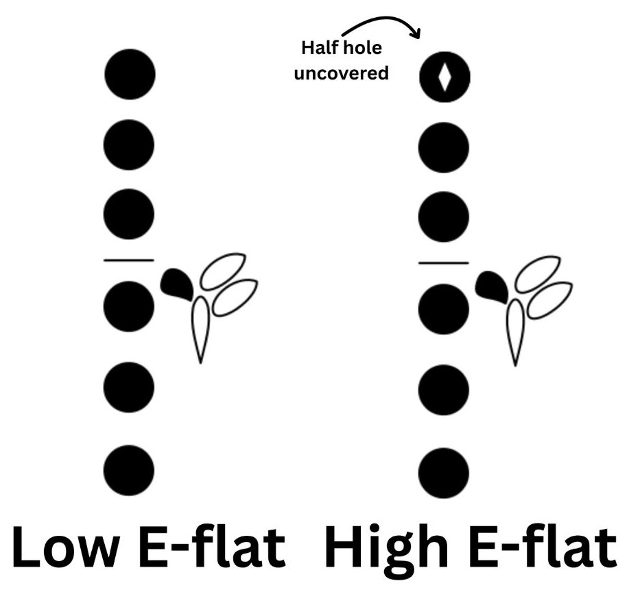 The alternate version of this note is called Left E-flat, and is played with the left-hand pinky, like this: