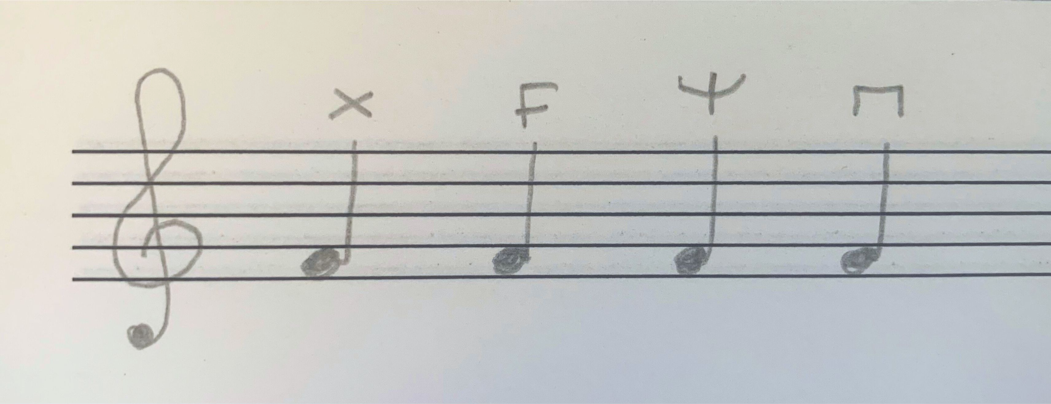 There are several ways of marking the Forked F in your music. Many people will mark the letter X or F to stand for forked. I personally draw a fork/trident, and I have also seen oboists draw a bracket (which looks like the ‘downbow’ symbol that string players use), in order to mimic the shape of the fingers when playing that note. Here’s a drawing of all those options. Try them all and see what clicks for you!