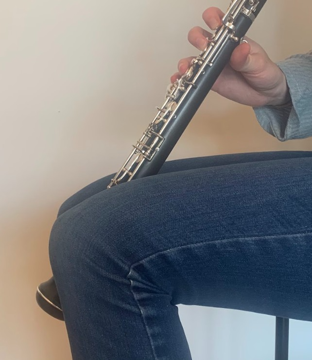 Finally, cover the two holes in the bell with your knees, like this: