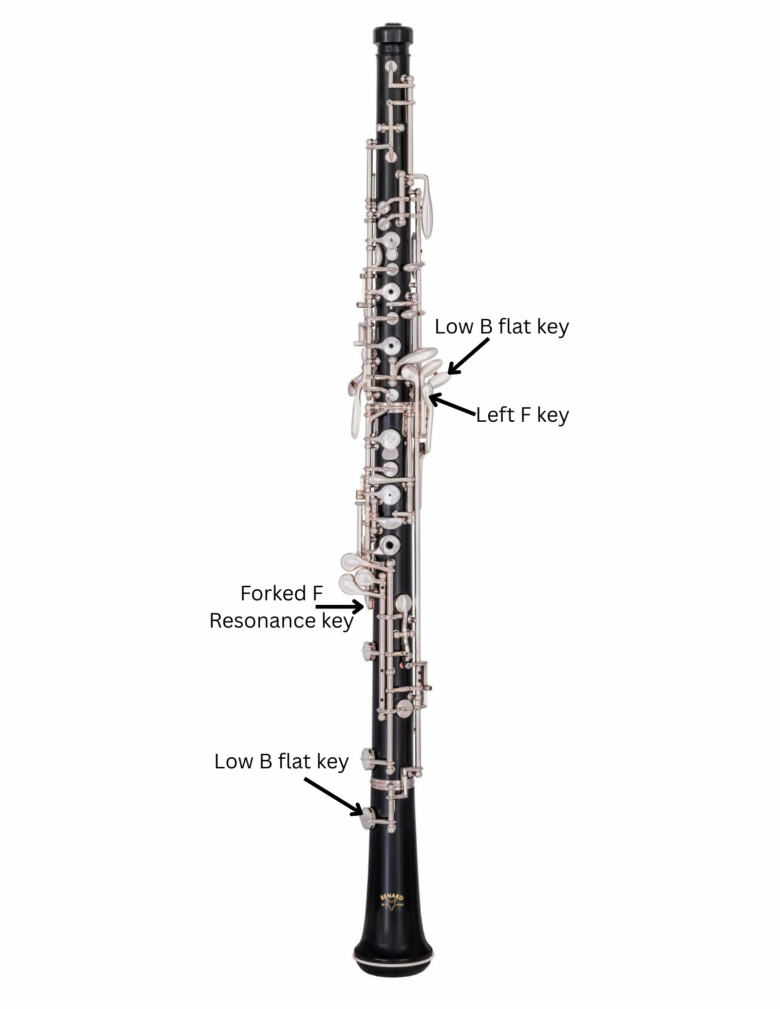 Depending on the make and model of your oboe, you may not have all the keys that a professional model instrument will have. Take a look at this diagram, and compare it to your oboe to see if you have a Left F Key, a Forked F Resonance Key (found on the side of your oboe), and/or Low B-flat Keys.